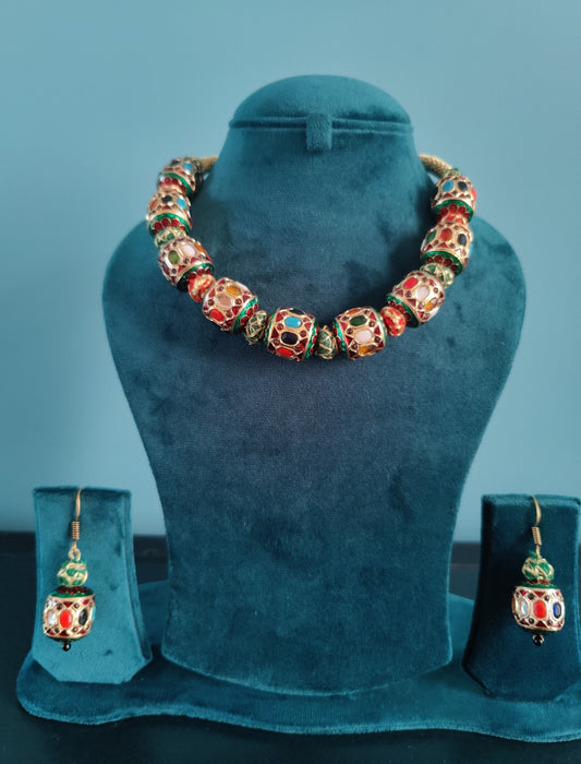 Chanasya set with green painted two Jhumkis with suspended green beads