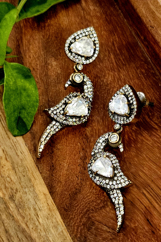 Antique gold finish earrings, parrot design with kundan and CZ detailing