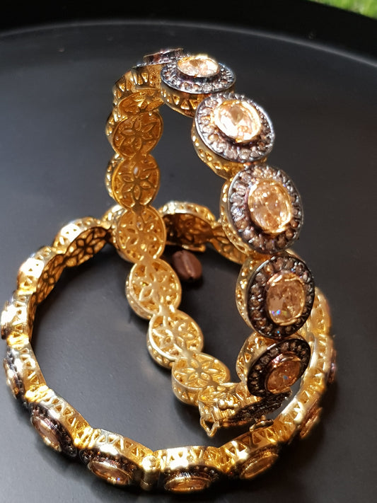 Bangles with yellow sapphire colour stones encircled by CZ , in gold finish (2 pcs)
