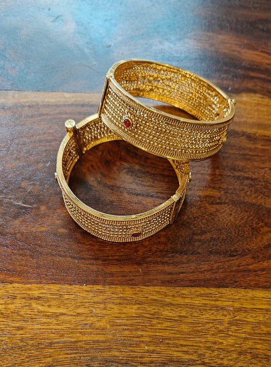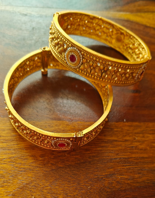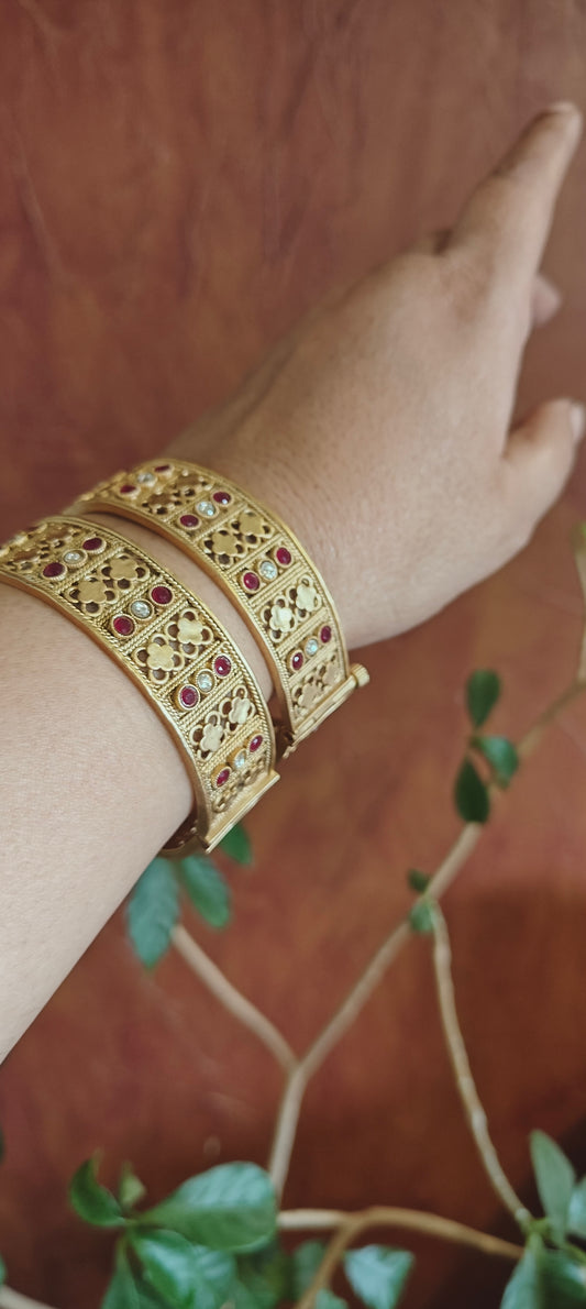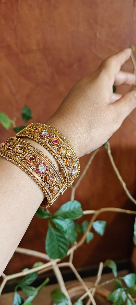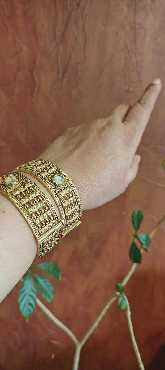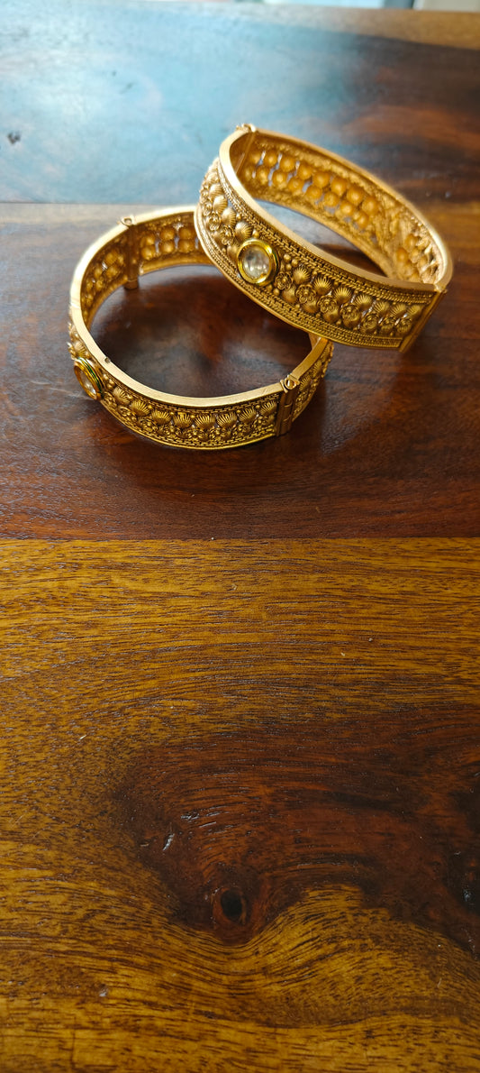 Golden karas with flowers carving with kundan(2pc)