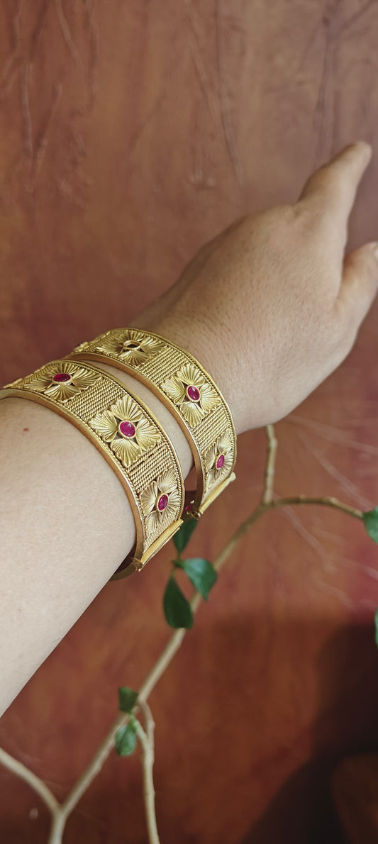 Golden karas with carved flowers and red stones(2pc)