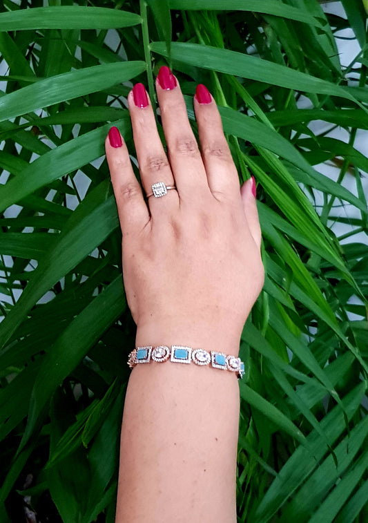 Platinum finish bracelet, square aqua/topaz stone surrounded by CZ interspaced with oval clear stone with CZ around