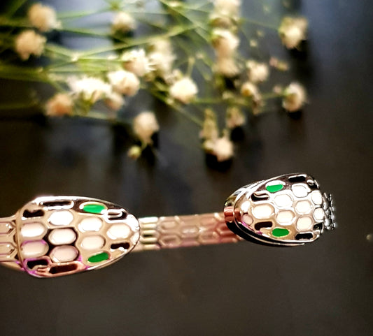 Snake head platinum/gold finish bracelet, white, black, green enamel work