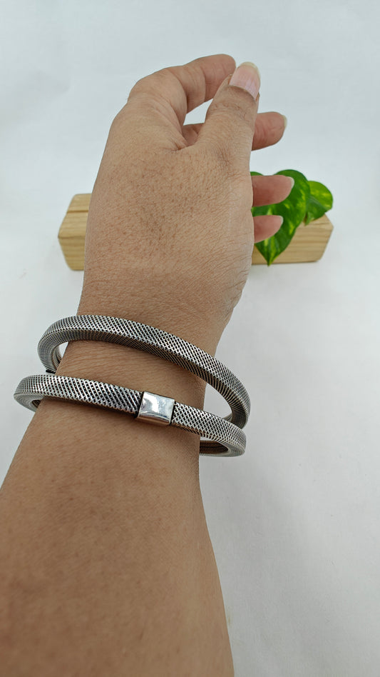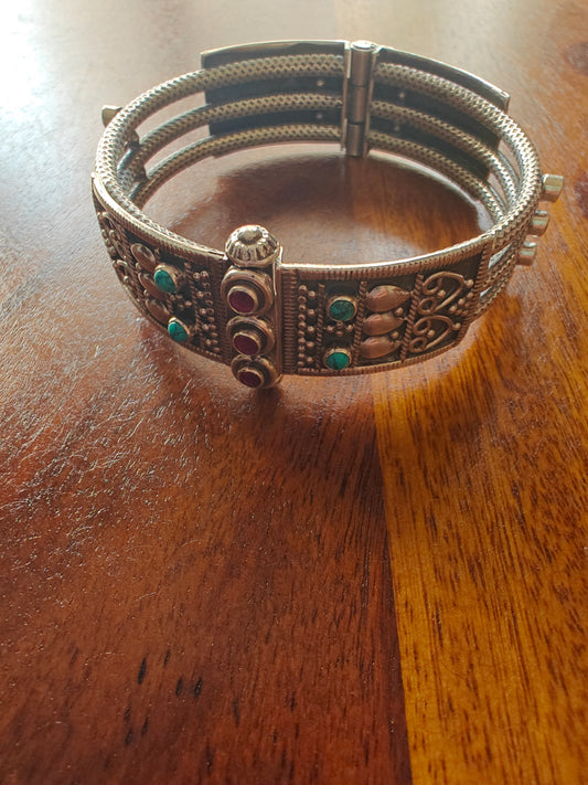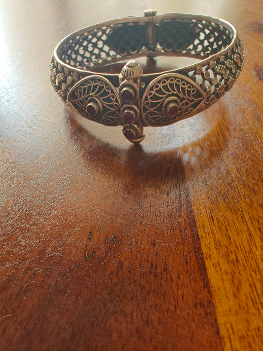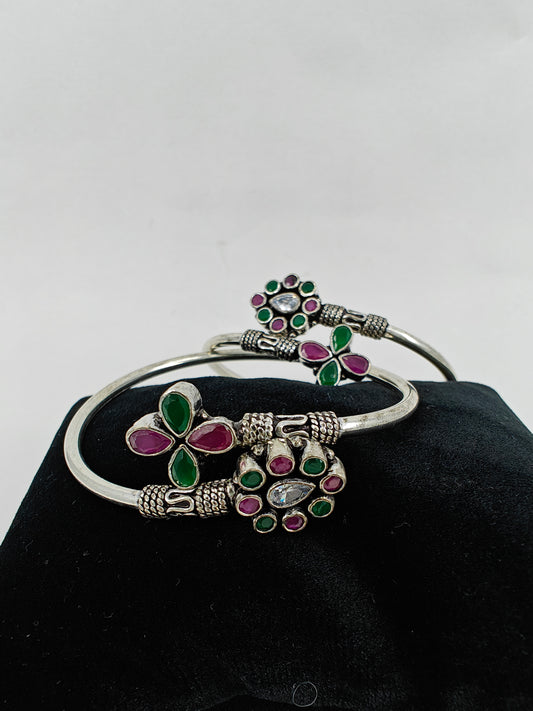 Silver pipe bangles with pink and green stone in flower design(2pcs)
