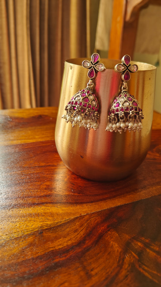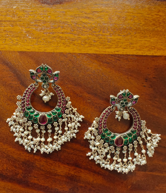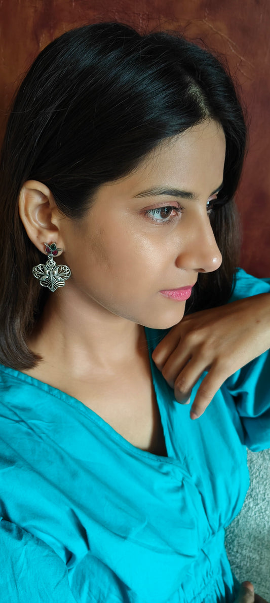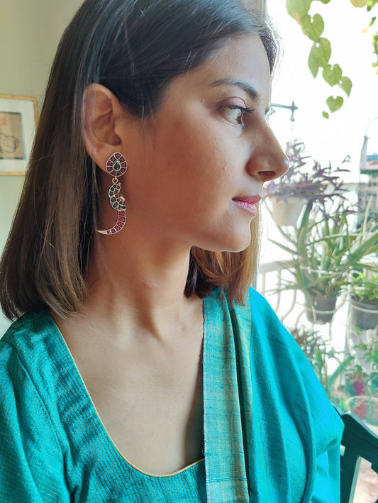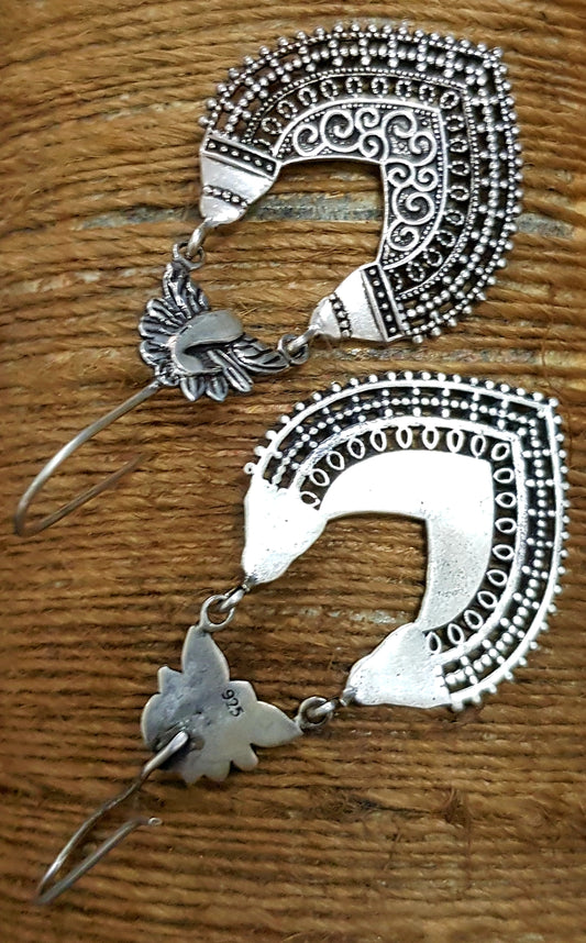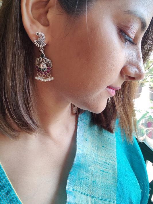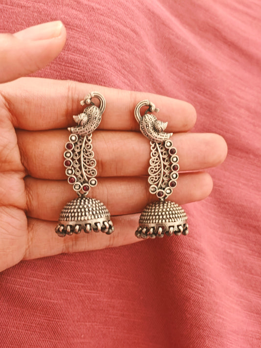 Silver jhumkis (earrings) on peacock studs with long carved feathers