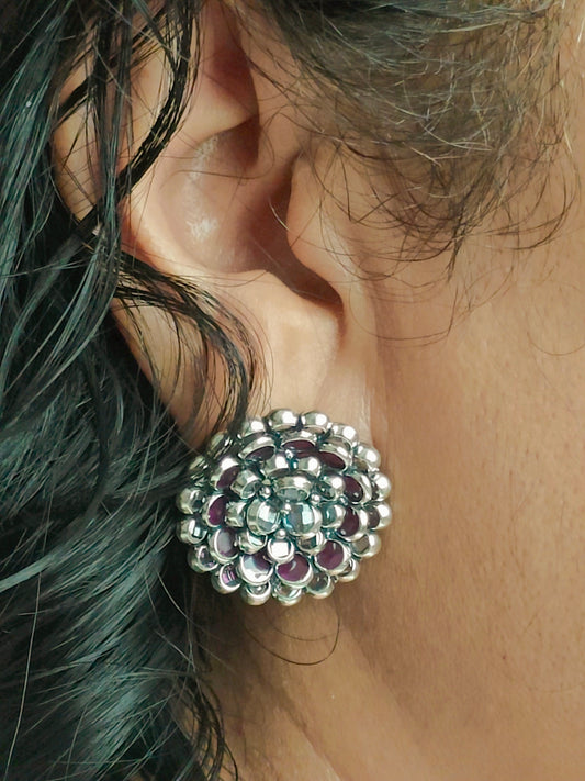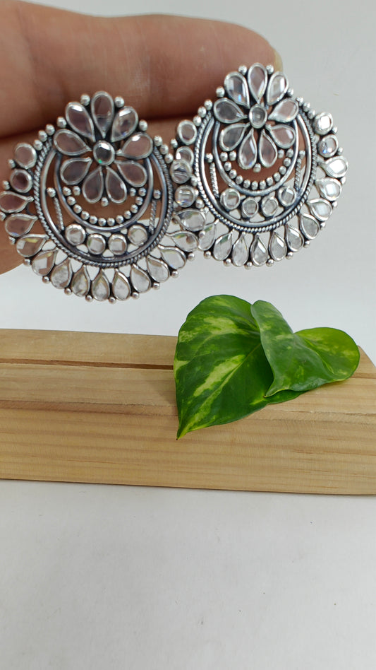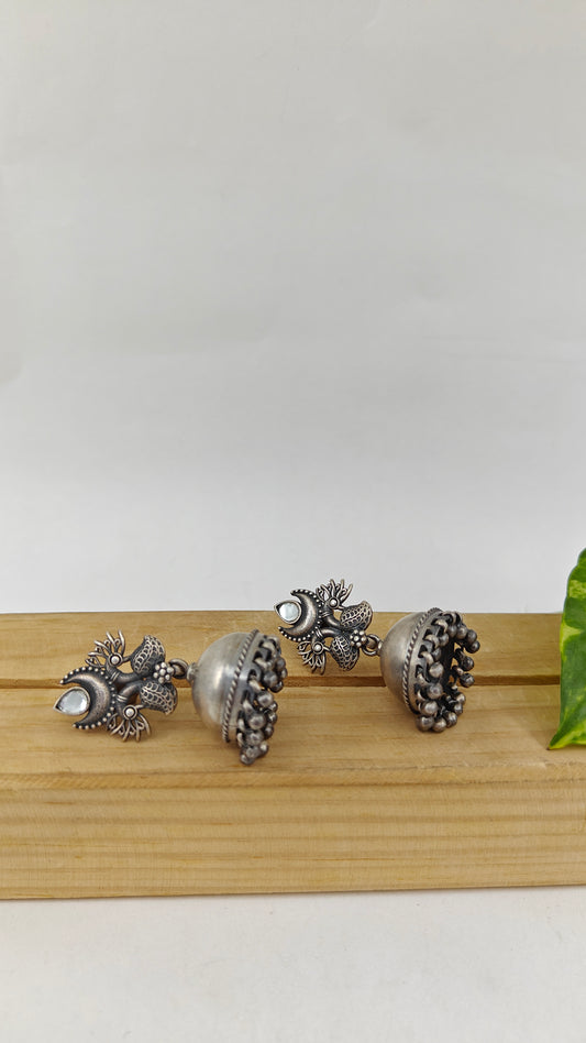 Silver jhumkis (earrings) on a peacock stud with open feather design and highlighted plumage