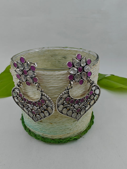 Silver hangings (earrings) with pink and clear stone on heart shaped piece on flower stud