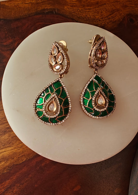 Long antique gold finish victorian earrings,crown stud above pair of peacock, CZ and green stone detailing