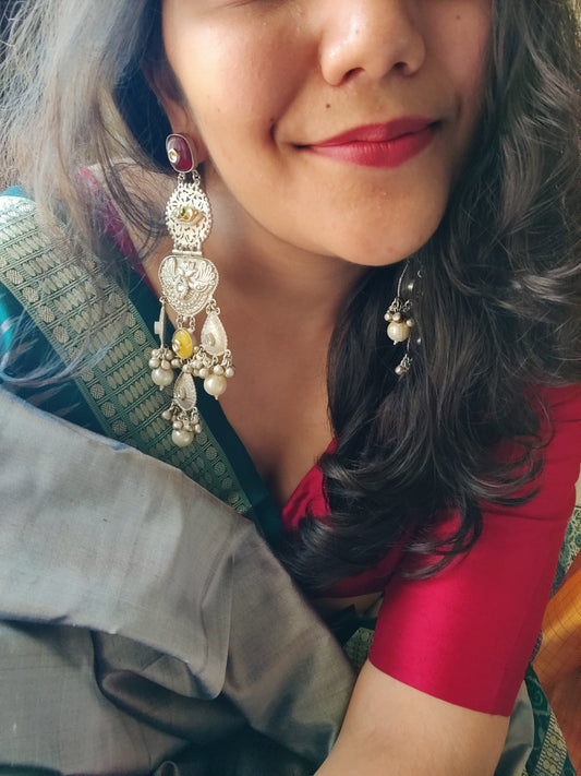 Silver jhumkis (earrings) with carvings on a peacock stud, pearl hangings