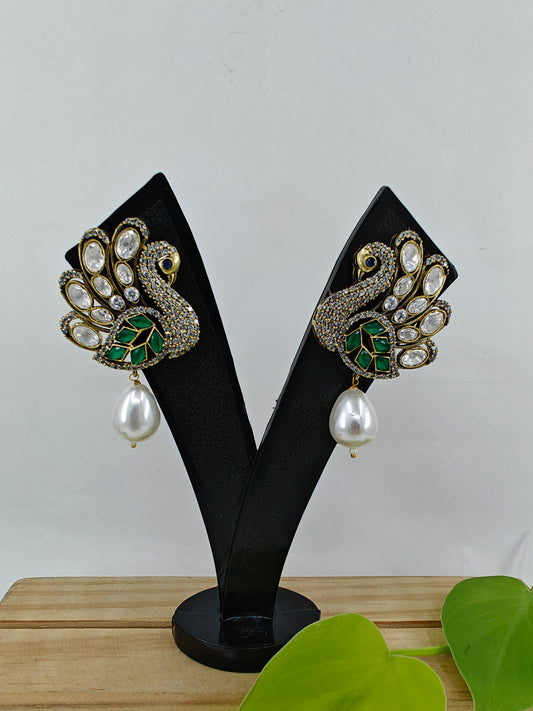 Peacock stud earrings with kundan studded 'feathers' and a pearl drop