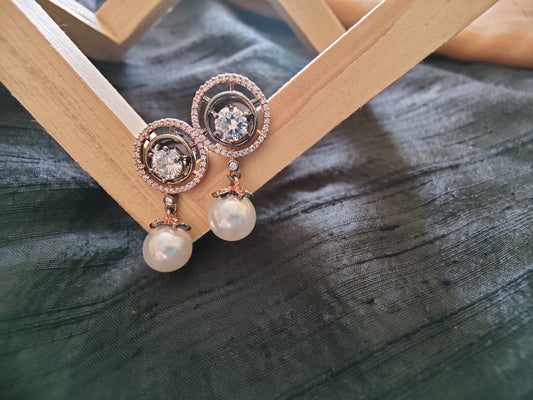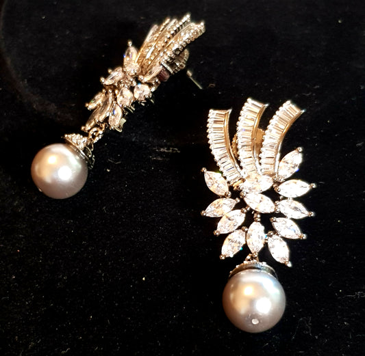 Antique finish flower design earrings with CZ and grey pearl hanging