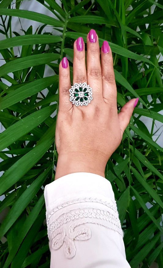 Antique rose gold finish ring with 3 triangular sapphire/emerald/ruby with CZ embellished flower pattern