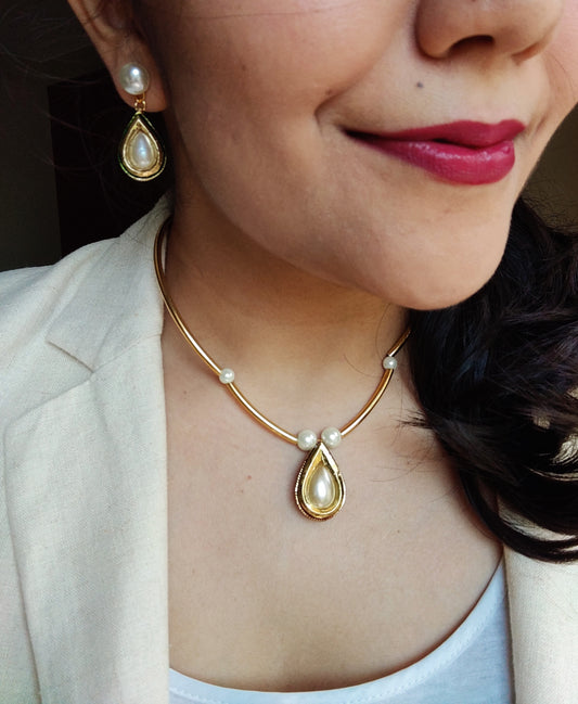 Golden pipe hasli reversible set with meenakari work with kundan on one side and pearls and stone on the other