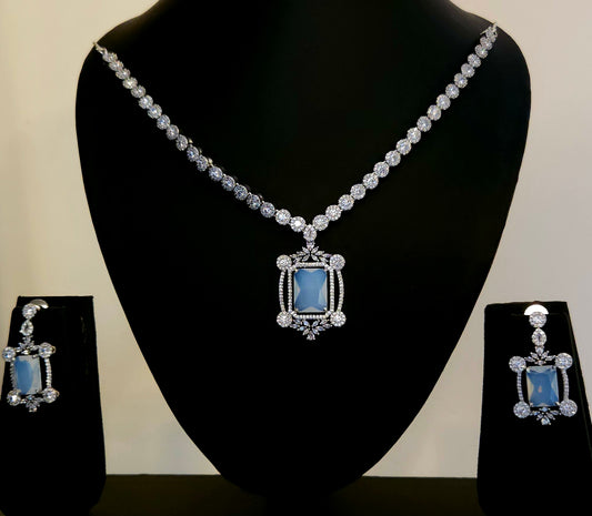 Platinum finish set with Milky white rectangular doublet pendant in CZ frame, matching earrings