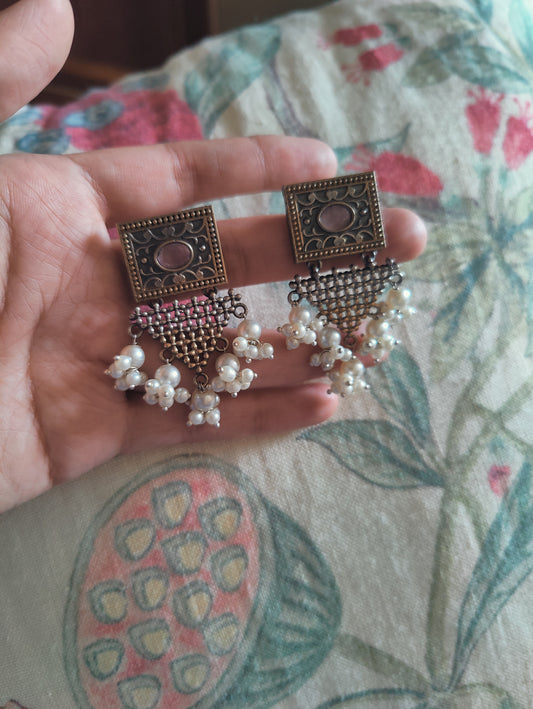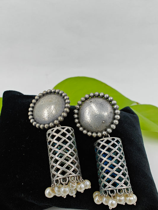 Earrings(jhumkis)in silver finish in cylindrical shape with pearl hangings