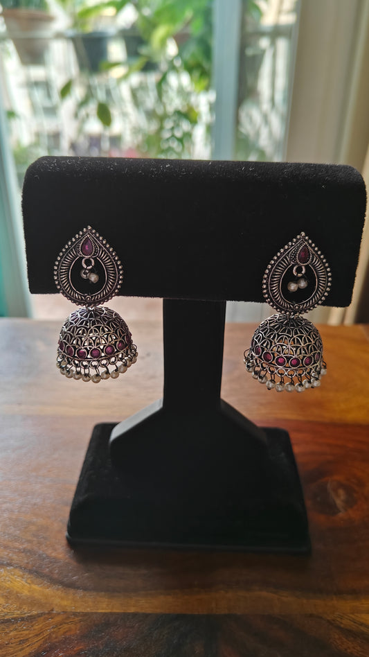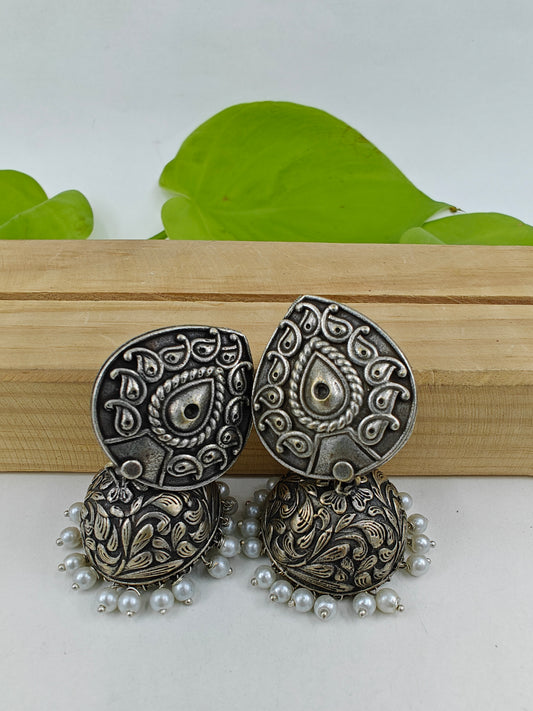 Earrings ( jhumkis) with pearl on drop shaped stud in silver finish