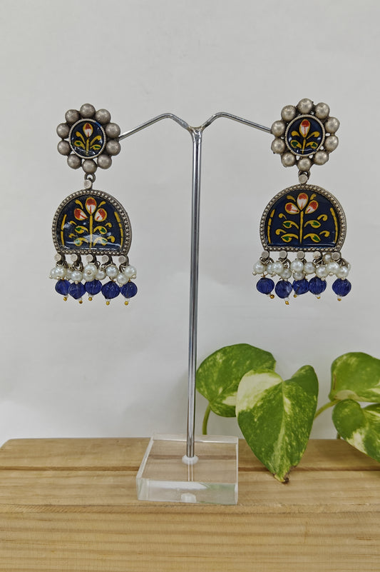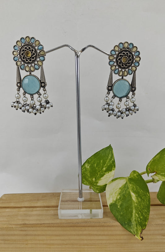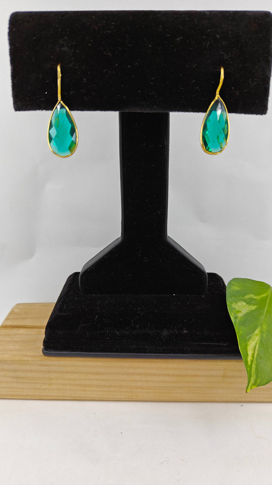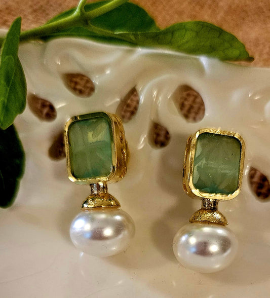 Gold finish stud (earring) amber/leaf green square stone with big pearl
