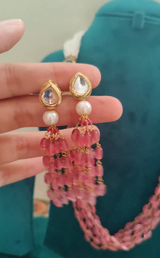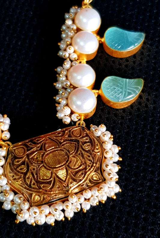 Dyanita choker set on poth pearl strings with mint green stones with work