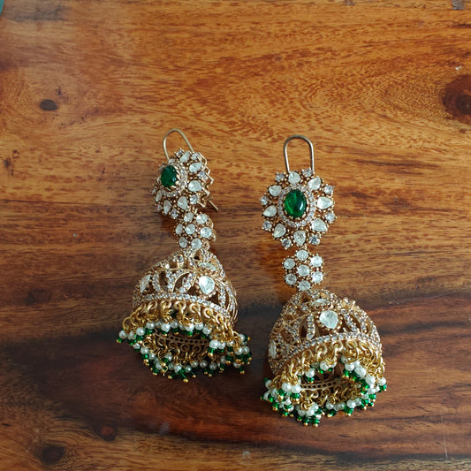 Long jhumkis with moissanite and emerald green stone