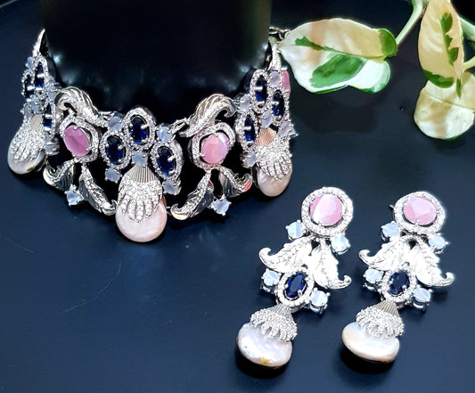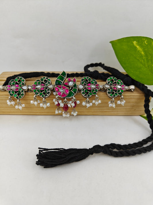 Silver choker necklace with a peacock centerpiece studded with ruby pink and emerald green stones