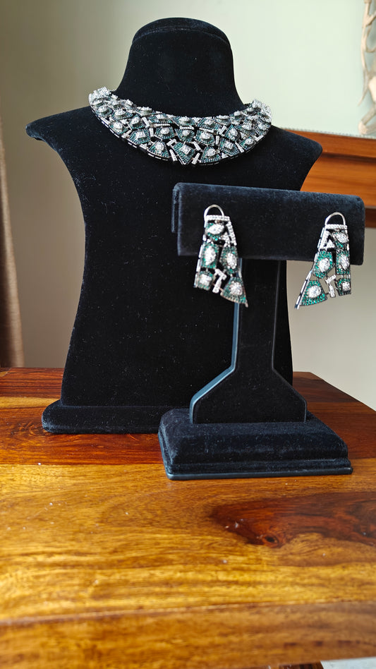 Hasli set in dual tone, pearched peacocks on stone pendant with Kundan work, matching earrings