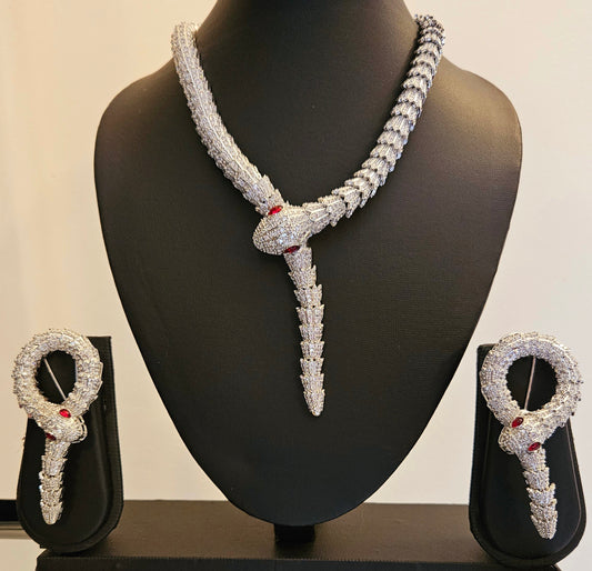 Platinum finish serpent set, necklace has big serpent eye, matching earrings