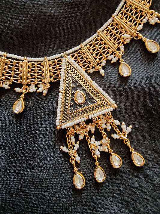 Intricate gold finish necklace and dangling earrings with black enamel, kundan and delicate miniature pearls