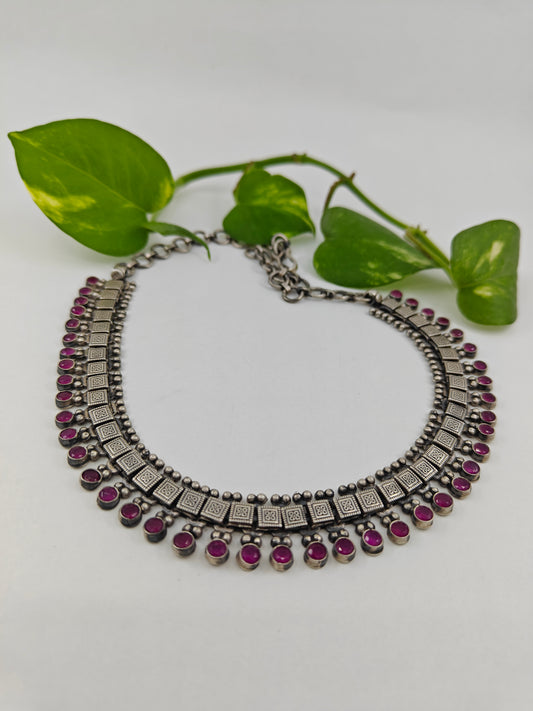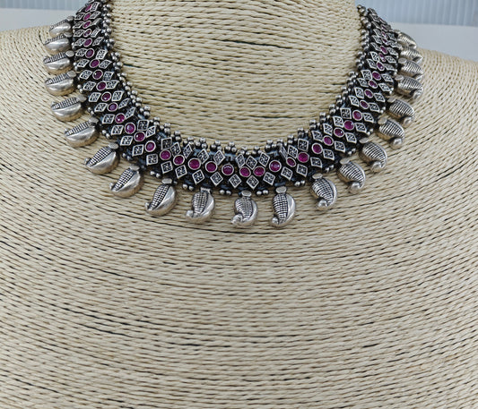Silver necklace in chattai design with ruby inlay and paisley pieces hanging at the bottom