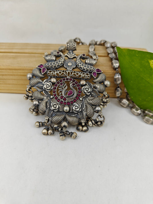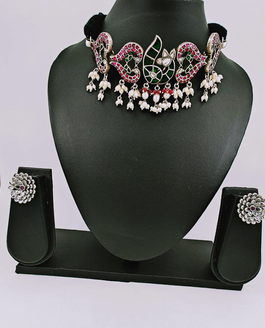 Silver choker necklace with a peacock centerpiece studded with ruby pink and emerald green stones