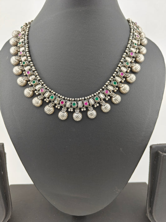 Silver necklace with ruby and emerald inlay and half domes at the bottom
