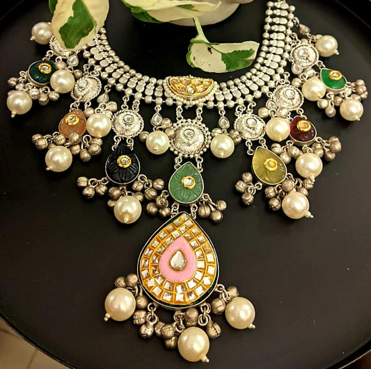 Silver finish big choker necklace with kundan work on multicoloured stones, pearl drops and silver ghungroos