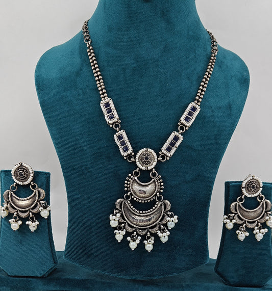 Antique silver finish choker set with pale peach, pale blue stone, matching jhumka (earrings)