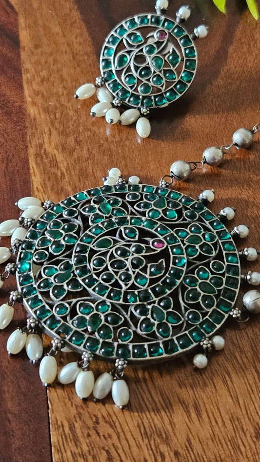 Silver finish long necklace set with big round pendant embellished with green/red stones, matching studs (earrings)