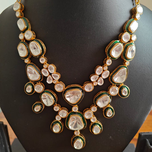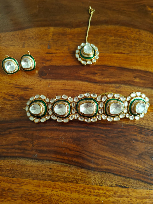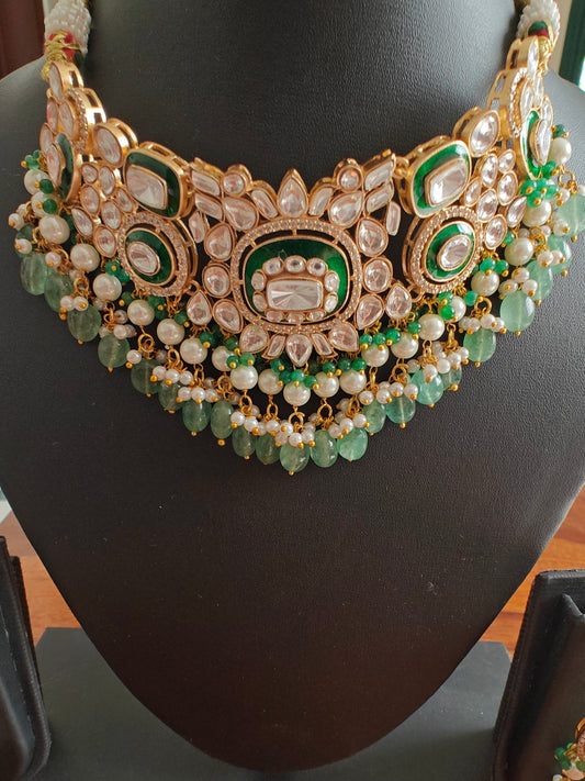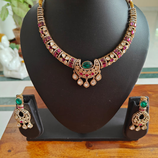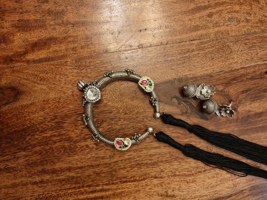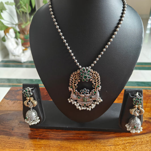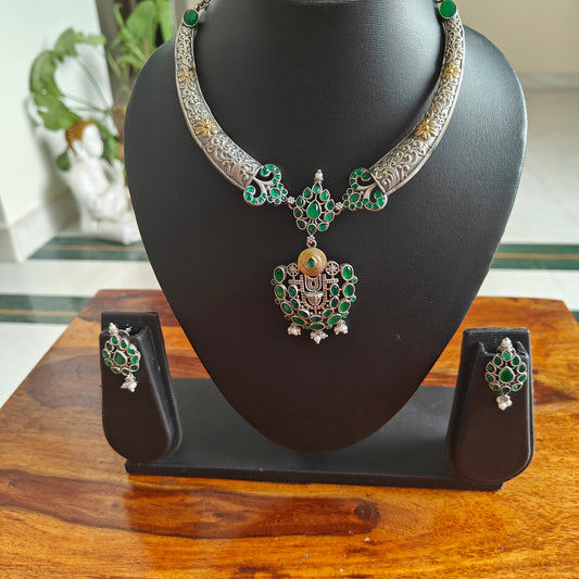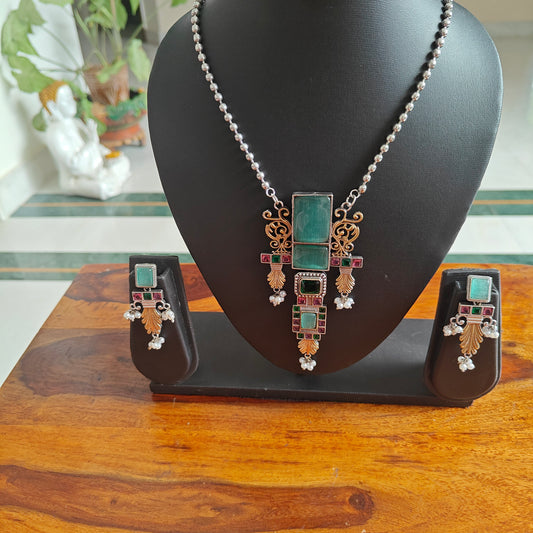 Dual tone tribal necklace set with a round centre piece with work on black thread