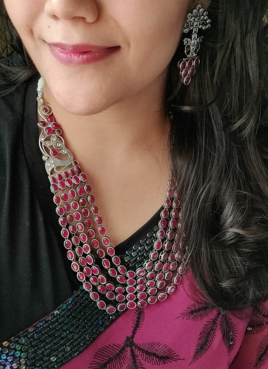 Antique silver finish set, multistrand necklace in deep pink stone, matching earrings