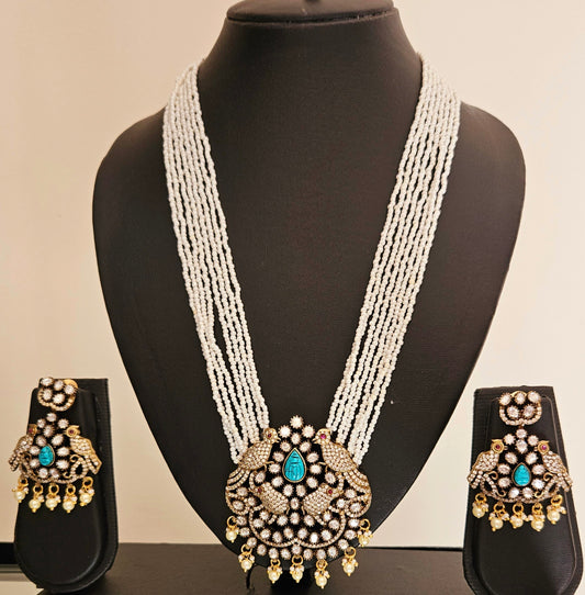 Antique finish set, poth pearl long necklace with parrot-elephant design pendant with blue firoza stone, matching earrings