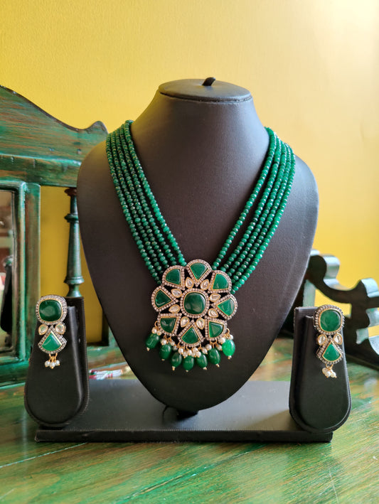 Long necklace set with big green stone and CZ flower pendant held with 5 layered stone beads, matching earrings