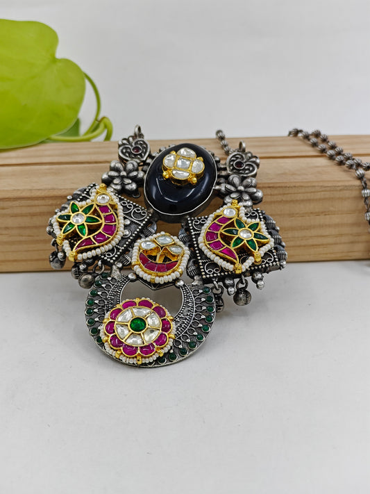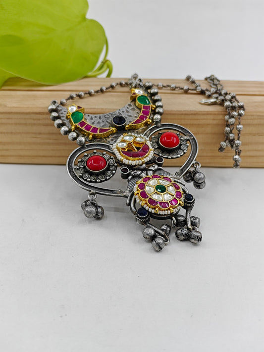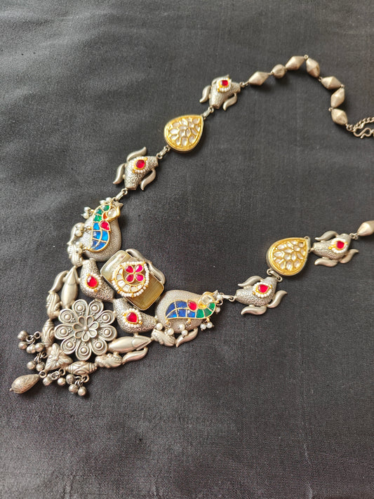 Big necklace in antique Silver finish with stone work in blue,green,red and poth pearls on top of pieces
