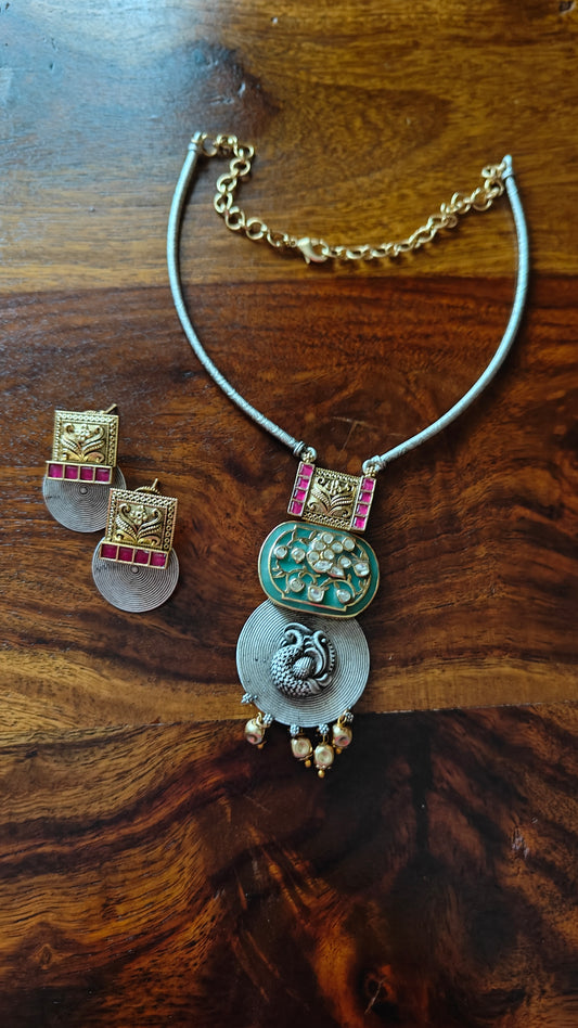 Silver finish set, long necklace with intricate work and pale pink/mint green detailing, matching earrings