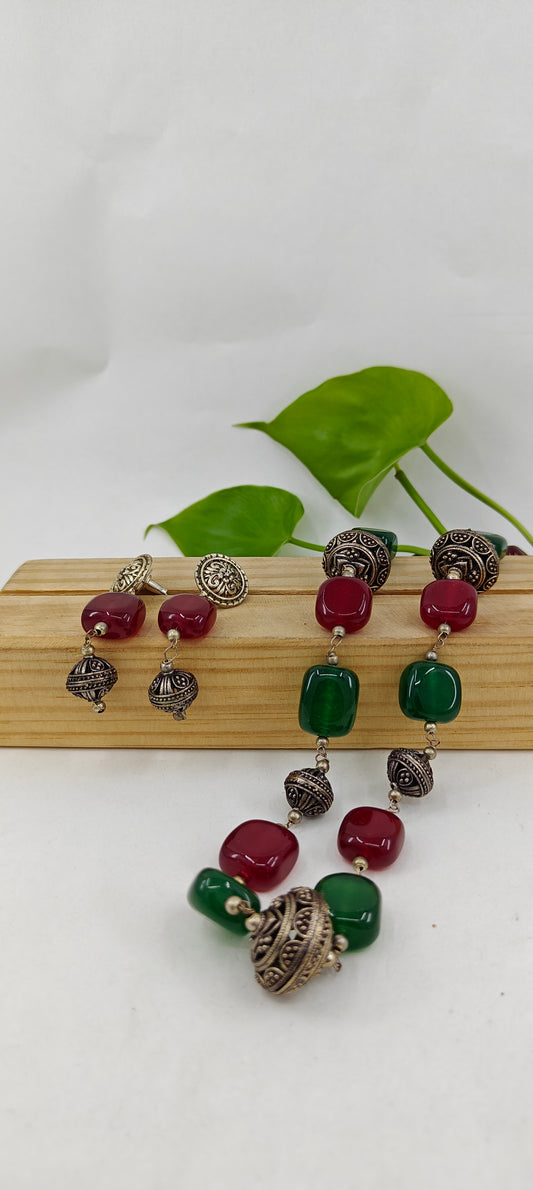 Dual tone set, round pendant with Lakshmi and parrot motif in beads and metal bead necklace, matching parrot studs (earrings)