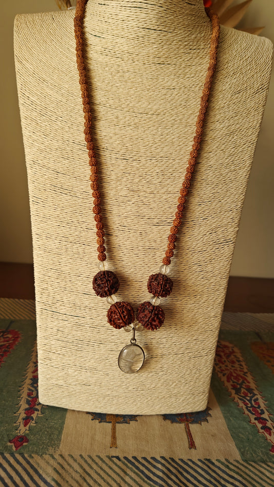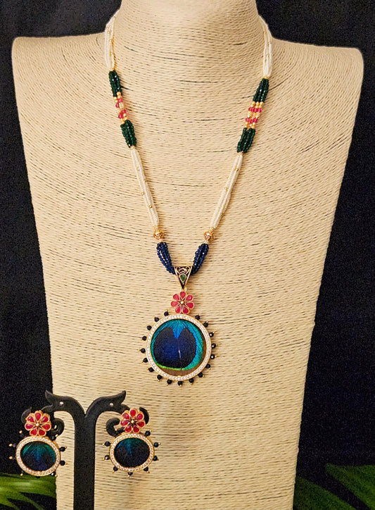 Pendant set with morpankh pendant framed with flower design in pearl and bead necklace, matching studs (earrings)