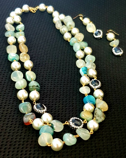 Set with a double string necklace with pearls,stone with CZ,multicolour stones