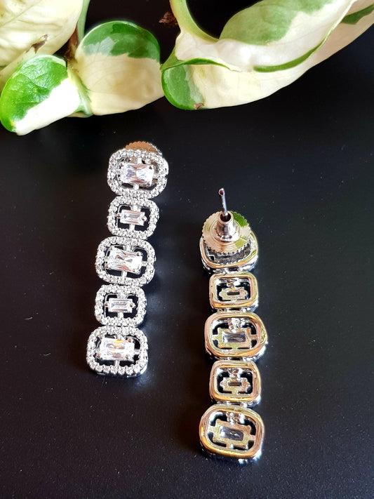 Platinum finish set in rectangular clear stone with CZ setting, matching danglers (earrings)