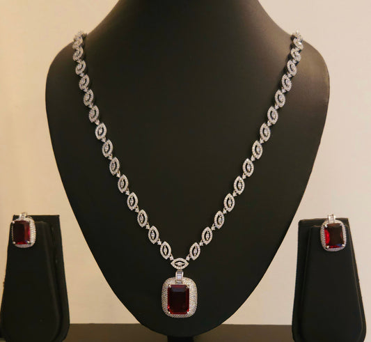Platinum finish set with ruby pendant in CZ necklace, matching earrings