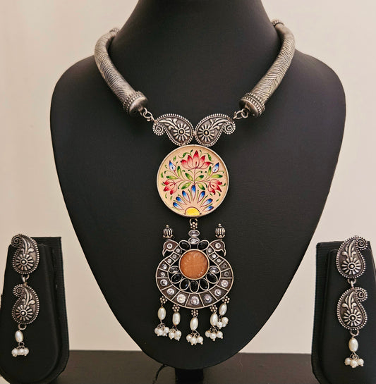 Silver finish hasli set with peach hand-painted pendant, matching earrings
