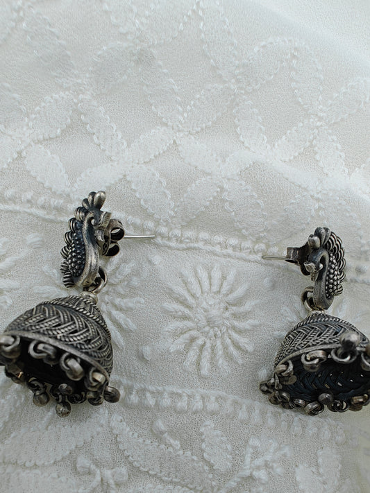 Silver jhumkas (earrings) on peacock stud, hanging ghungroos at the bottom