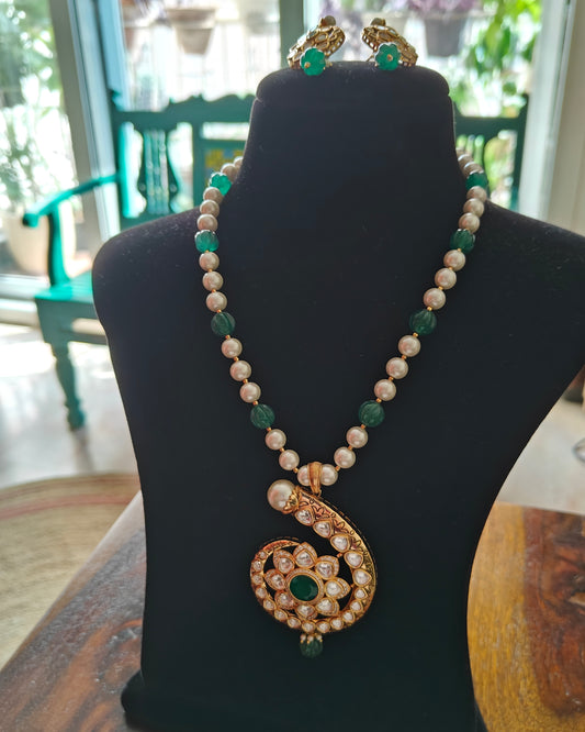 Jalela set with spiral kundan pendant on pearl and emerald stone ring