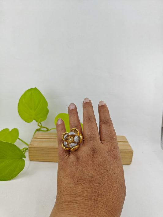 Dual tone ring with an open flower design with silver and gold finish petals
