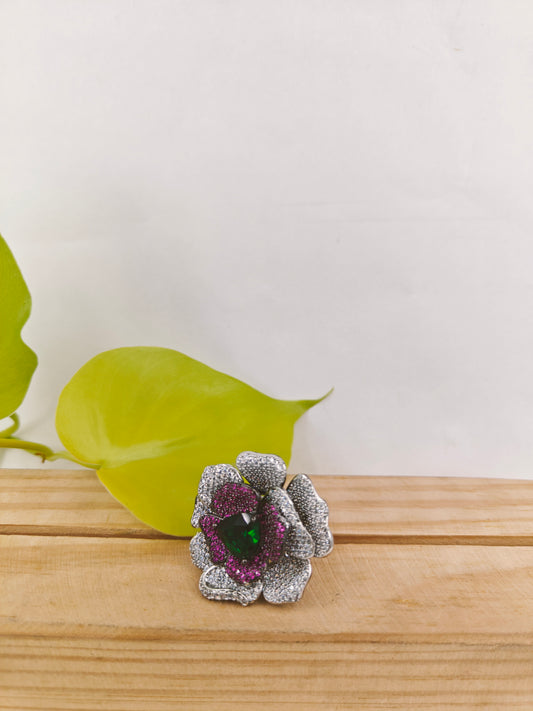 Platinum finish ring with nano stones in amythist and platinum colour in a flower design