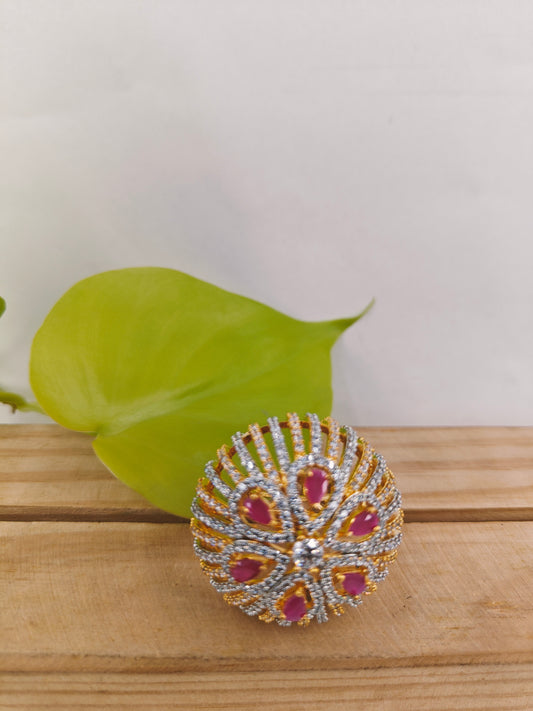 Gold and platinum finish dome shaped ring highlighted with ruby pink stones and CZ